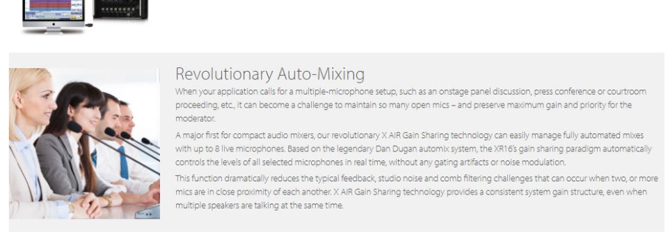 - Revolutionary Dugan*-style Auto-Mixing automatically manages microphone gain sharing (future firmware)