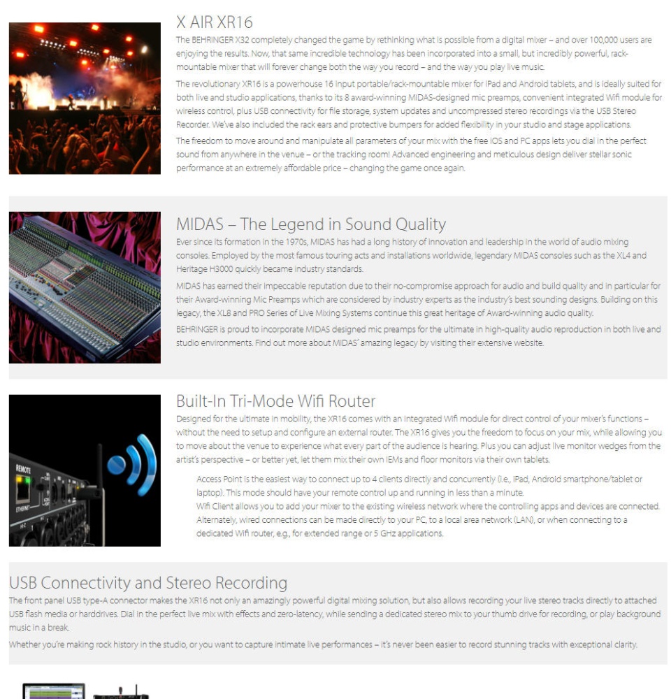 The revolutionary XR16 is a powerhouse 16 input portable/rack-mountable mixer for iPad and Android tablets, and is ideally suited for both live and studio applications, thanks to its 8 award-winning MIDAS designed mic preamps, convenient integrated Wifi module for wireless control, plus USB connectivity for file storage, system updates and uncompressed stereo recordings via the USB Stereo Recorder. We’ve also included the rack ears and protective bumpers for added flexibility in your studio and stage applications.
