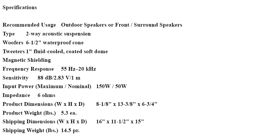 Recommended Usage Outdoor Speakers or Front / Surround Speakers