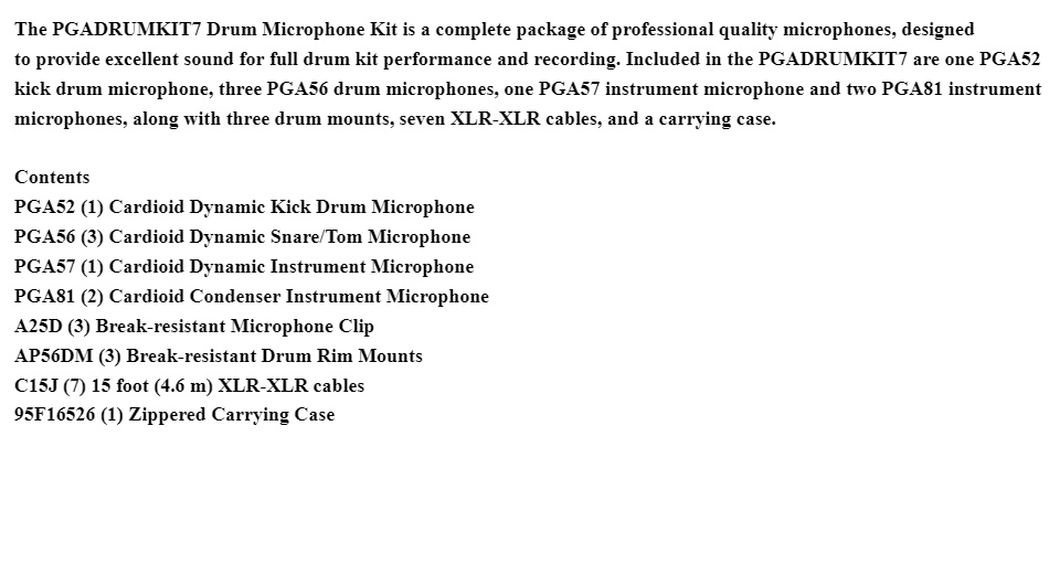 to provide excellent sound for full drum kit performance and recording. Included in the PGADRUMKIT7 are one PGA52 kick drum microphone, three PGA56 drum microphones, one PGA57 instrument microphone and two PGA81 instrument microphones, along with three drum mounts, seven XLR-XLR cables, and a carrying case.