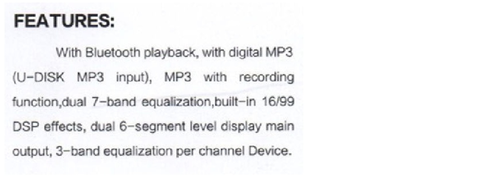dual 7-band equalization, built-in 16/99 DSP effects, dual 6-segment level display main output, 3-band
