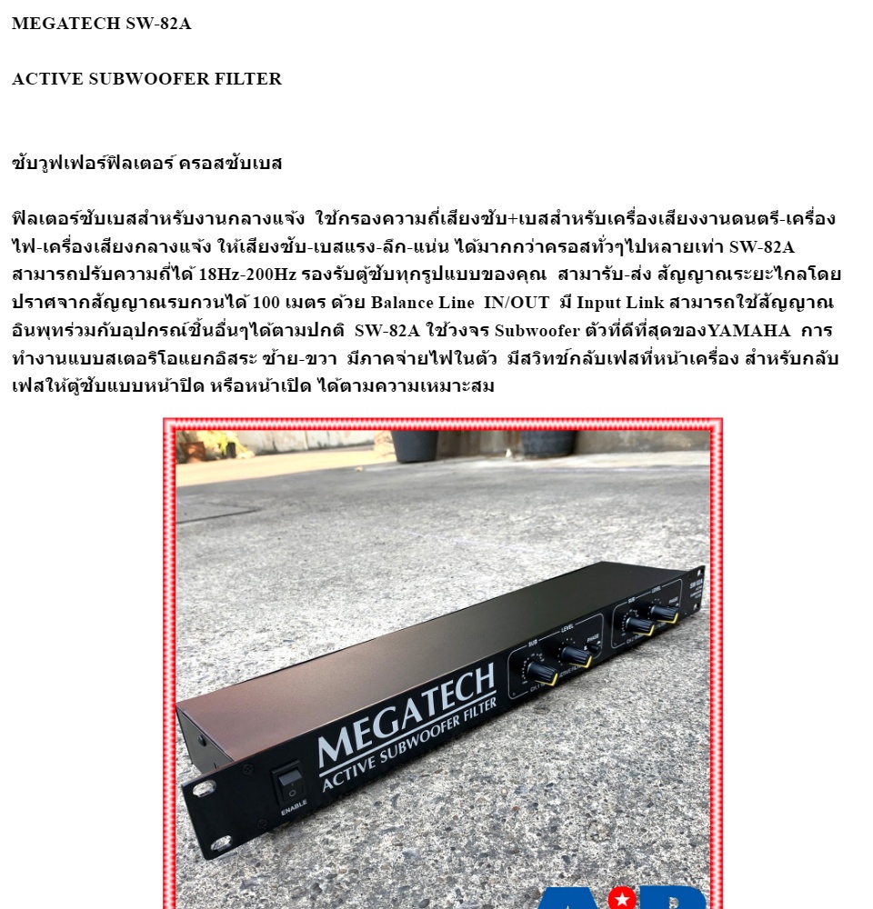 ฟิลเตอร์ซับเบสสำหรับงานกลางแจ้ง ใช้กรองความถี่เสียงซับ+เบสสำหรับเครื่องเสียงงานดนตรี-เครื่องไฟ-เครื่องเสียงกลางแจ้ง ให้เสียงซับ-เบสแรง-ลึก-แน่น ได้มากกว่าครอสทั่วๆไปหลายเท่า SW-82A สามารถปรับความถี่ได้ 18Hz-200Hz รองรับตู้ซับทุกรูปแบบของคุณ สามารับ-ส่ง สัญญาณระยะไกลโดยปราศจากสัญญาณรบกวนได้ 100 เมตร ด้วย Balance Line IN/OUT มี Input Link สามารถใช้สัญญาณอินพุทร่วมกับอุปกรณ์ชิ้นอื่นๆได้ตามปกติ SW-82A ใช้วงจร Subwoofer ตัวที่ดีที่สุดของYAMAHA การทำงานแบบสเตอริโอแยกอิสระ ซ้าย-ขวา มีภาคจ่ายไฟในตัว มีสวิทช์กลับเฟสที่หน้าเครื่อง สำหรับกลับเฟสให้ตู้ซับแบบหน้าปิด หรือหน้าเปิด ได้ตามความเหมาะสม