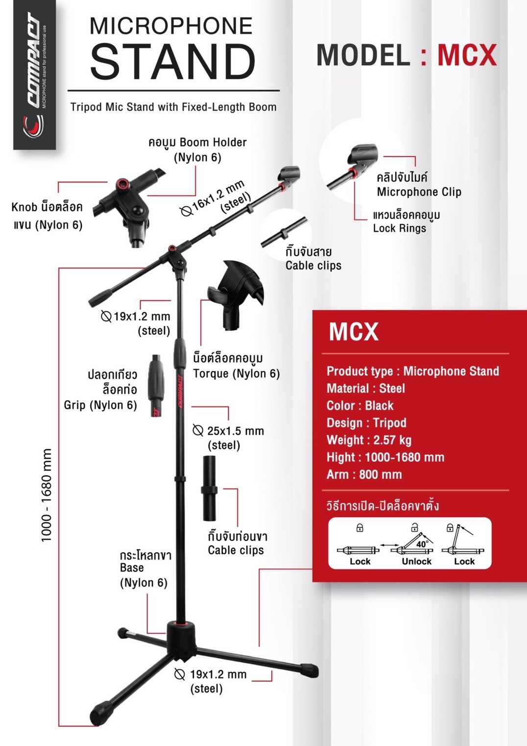 COMPACT MCX ขาตั้งไมโครโฟน แบบฐาน 3 ขา มีแขนไมค์บูม ยาว 800 มม. และปรับความสูงได้ 1000-1680 มม. สามารถพับเก็บได้ น้ำหนักเบา แข็งแรงทนทาน