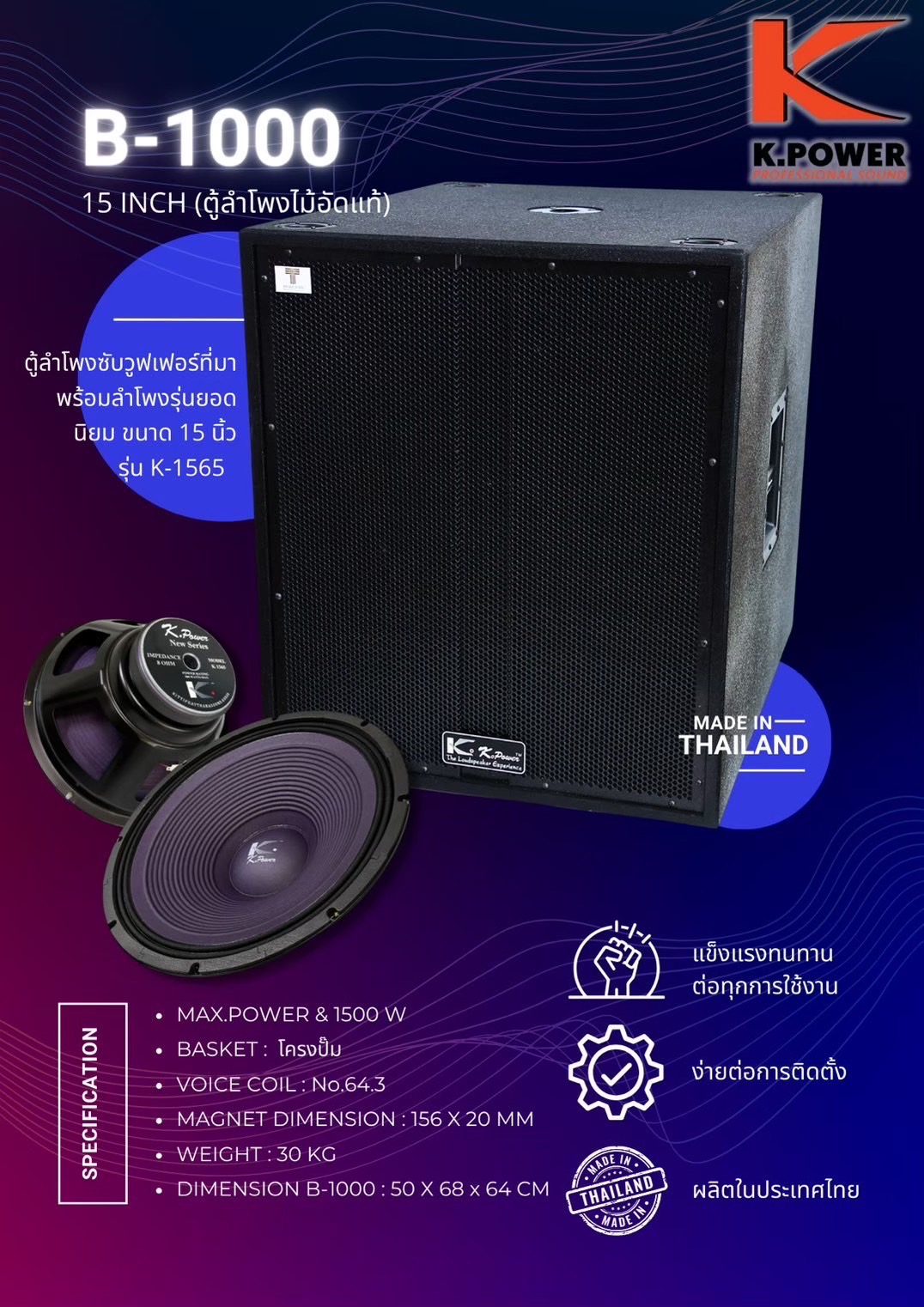 K.POWER B-1000 ตู้ลำโพงซับ 15นิ้ว ไม้อัดแท้
