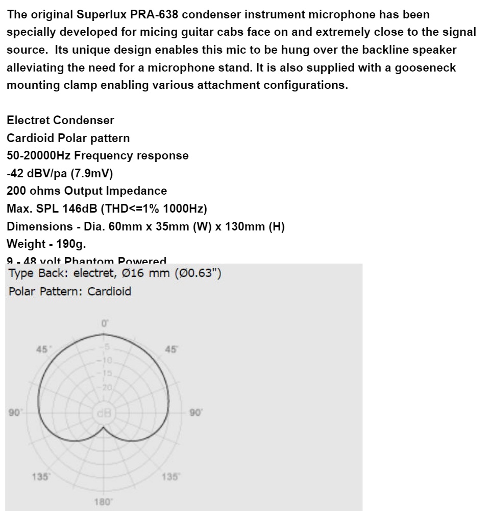 The original Superlux PRA-638 condenser instrument microphone has been specially developed for micing guitar cabs face on and extremely close to the signal source. Its unique design enables this mic to be hung over the backline speaker alleviating the need for a microphone stand. It is also supplied with a gooseneck mounting clamp enabling various attachment configurations.