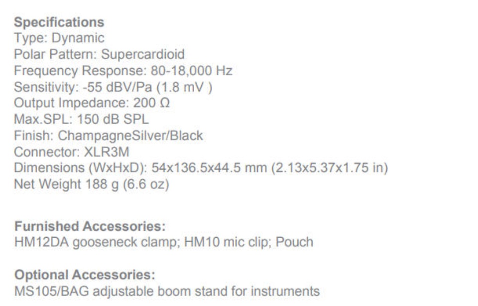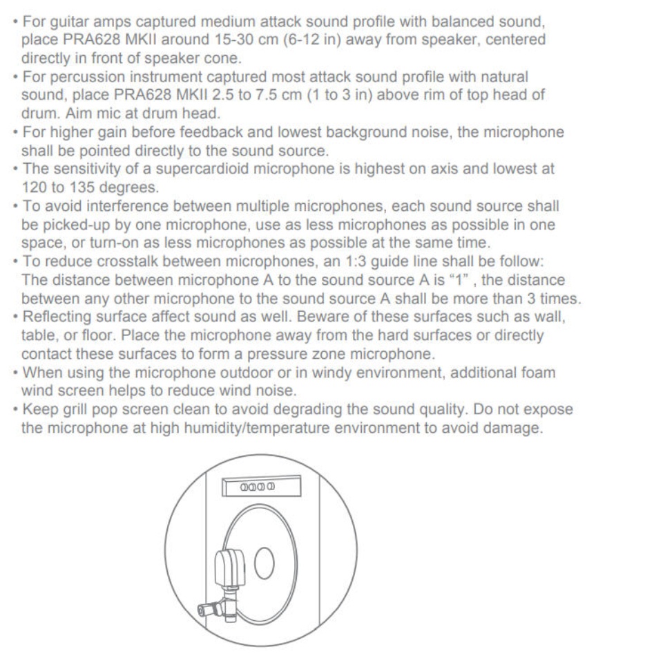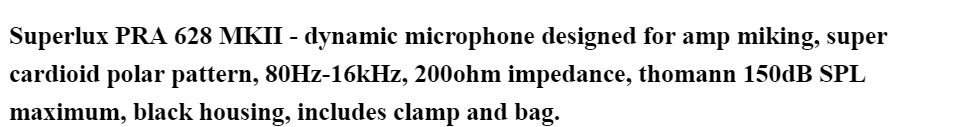 Superlux PRA 628 MKII - dynamic microphone designed for amp miking, super cardioid polar pattern, 80Hz-16kHz, 200ohm impedance, thomann 150dB SPL maximum, black housing, includes clamp and bag.