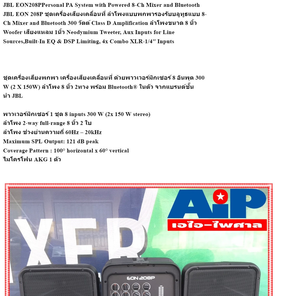 JBL EON 208P ชุดเครื่องเสียงเคลื่อนที่ คลาส D 300 วัตต์ เพาเวอร์มิกเซอร์ 8 ชาแนล Bluetooth® ในตัว พร้อมไมโครโฟน AKG JBL EON 208 Live Portable Sound เอไอ-ไพศาล +++